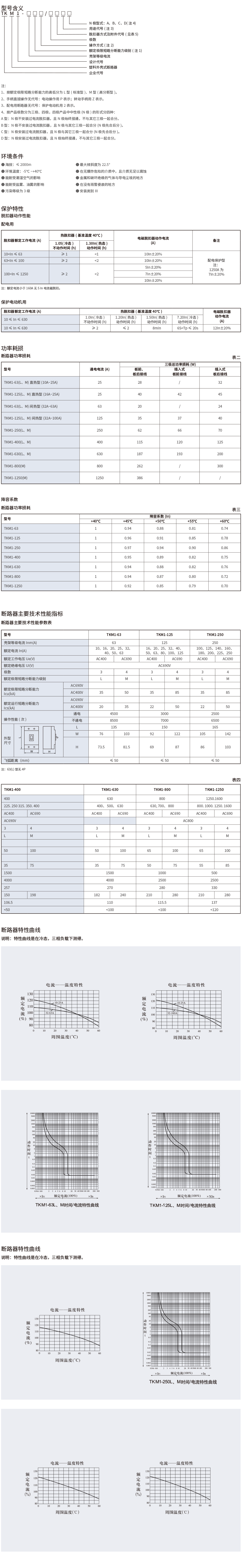 TKM1系列塑料外壳式断路器(以下简称断路器),适用于交流50Hz(或60Hz),其额定绝缘电压为690V(TKM1-63型为500V),额定工作电压400V及以下,额定工作电流至1250A的电路中作不频繁转换及电动机不频繁起动之用(Inm≤630A及以下)。断路器具有过载、短路和欠电压保护功能,能保护线路和电源设备不受损坏。